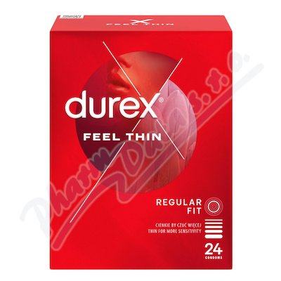 Kondomy Durex Feel Thin ve standardní velikosti. Tenké kondomy, lubrikované silikonovým gelem, anatomicky tvarované pro snadnější nasazení a lepší prožitek. Jsou vyrobeny z kaučukového latexu Ochrana před početím, HIV, sexuálně přenosnými chorobami.