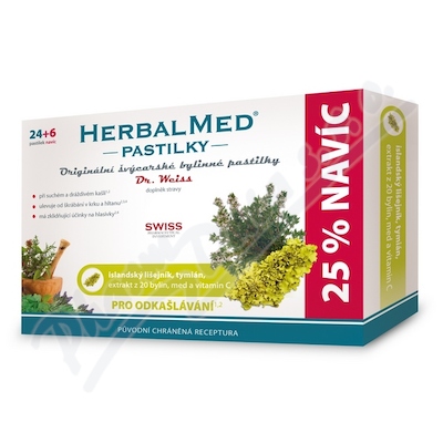 HERBALMED pastilky Dr.Weiss-Originální švýcarské bylinné pastilky se vyrábějí podle původní receptury ve Švýcarsku. Účinnost a jedinečnost zaručuje pečlivě kontrolovaná kvalita a unikátní kombinace více než 20 extraktů z léčivých bylin, medu a vit.C.