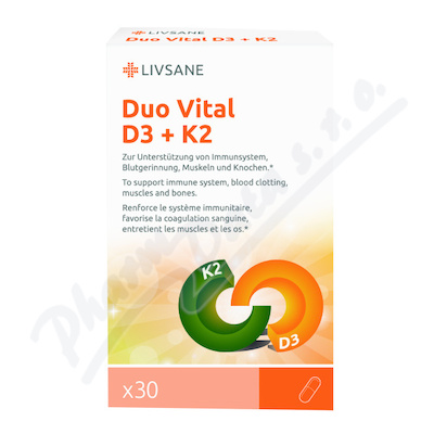LIVSANE Duo Vital D3+K2 na podporu vitality obsahuje kombinaci vitaminů D3 a K2. Tyto vitaminy významně přispívají k udržení zdraví v každém věku, např.: přispívají k udržení normálního stavu kostí, činnosti svalů, imunitního systému a srážlivosti krve.