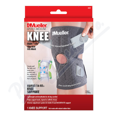 Produktová řada Mueller Adjust-To-Fit® pomáhá zabránit dalšímu zranění tím, že omezuje rozsah pohybu a urychluje tak zotavení. Patentované, nastavitelné vnitřní popruhy poskytují komfortní zpevnění kolenní oblasti a snadno se uchycují.