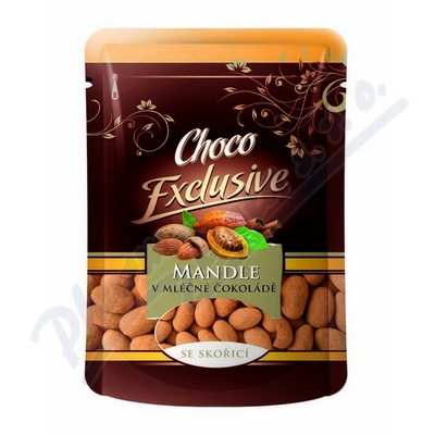 Mandle v mléčné čokoládě se skořicí. Výrobek je složen z pražených mandlí obalených v mléčné čokoládě a mleté skořici.